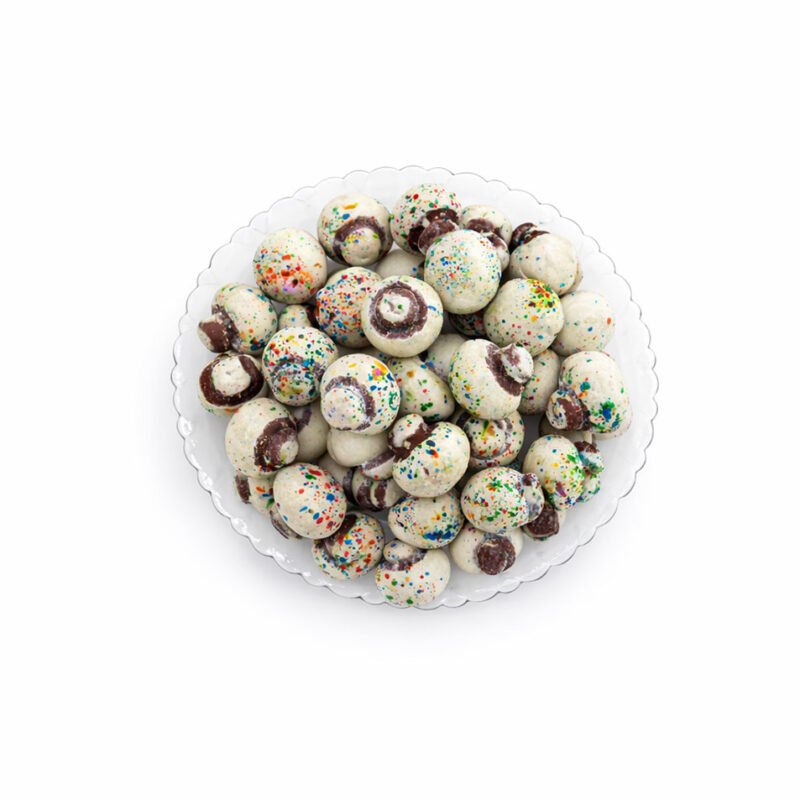 شوكولاتة بيضاء على شكل فطر مزينة برشات ملونة، تجمع بين الطعم اللطيف والمظهر المرح، مناسبة للتقديم والضيافة وتلفت انتباه الأطفال والكبار.