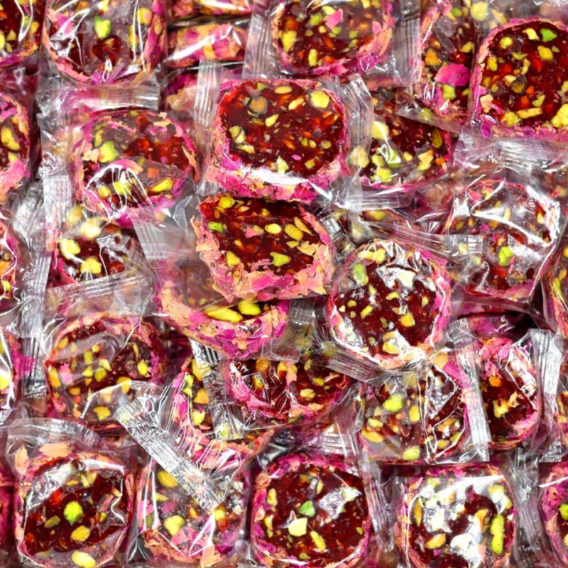 راحة بالرمان والفستق الحلبي مغلفة بالورد – 500غ