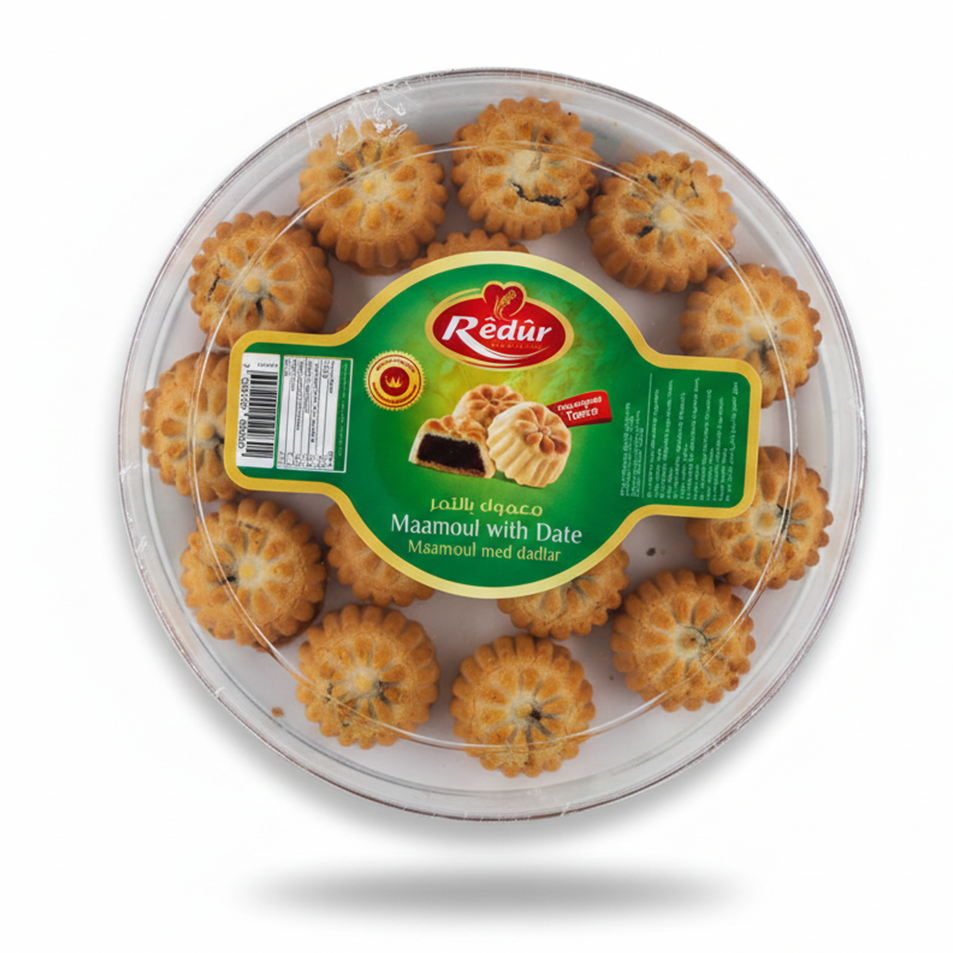 معمول فاخر محشو بالتمر من ماركة Redur ، يتميز بعجينة هشة ونكهة غنية تجمع بين طراوة العجين وحلاوة التمر الطبيعية. خيار مثالي لمحبي الحلويات التقليدية بطابع أصيل يناسب جميع الأوقات.
