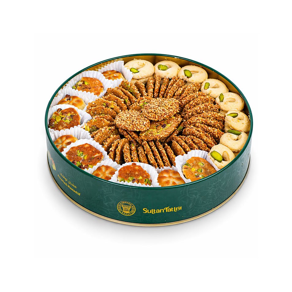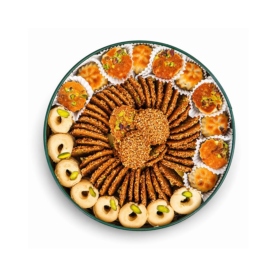 علبة متنوعة تجمع بين أشهر الحلويات الجافة بنكهات مختلفة وقوام متنوع، مثالية للضيافة وتناسب جميع الأذواق في صندوق واحد أنيق.