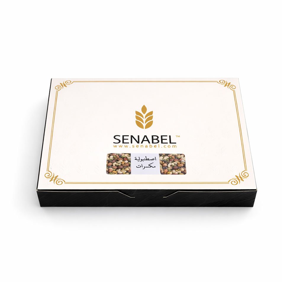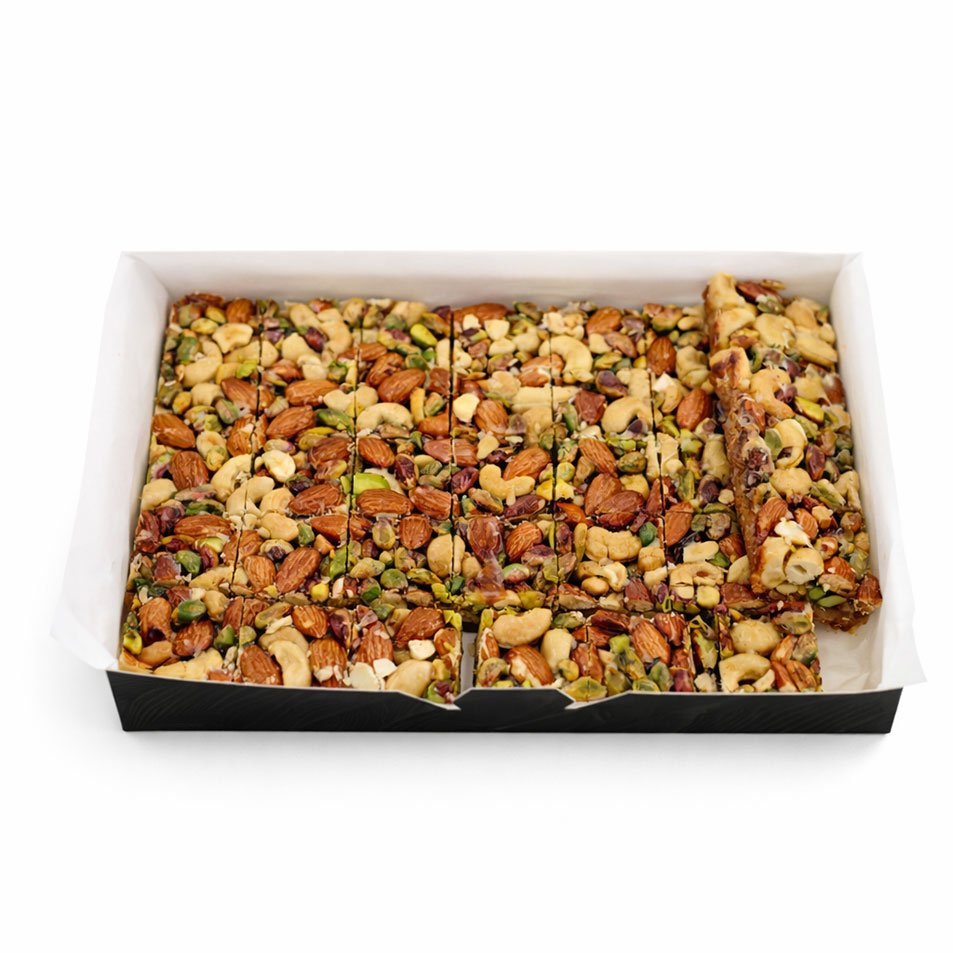 طبقات غنية مغطاة بمزيج فاخر من المكسرات المشكلة، تجمع بين الطعم المقرمش والنكهة العميقة لتجربة مميزة في كل قطعة.