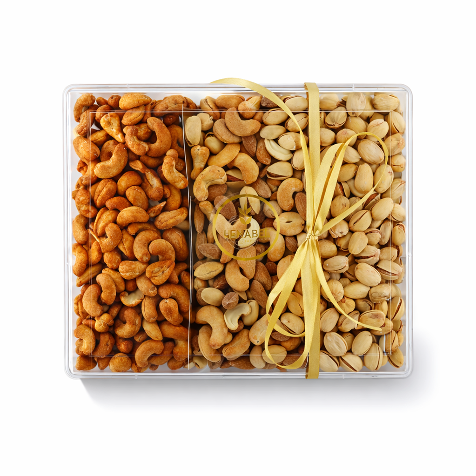 تشكيلة فاخرة من المكسرات المختارة بعناية، مقدمة في بوكس أنيق مع تقسيم عملي وشريط ذهبي مميز، خيار مثالي للضيافة الراقية أو الهدايا. يحتوي على فستق مالح، كاجو مدخن، تشكيلة مكسرات مالحة