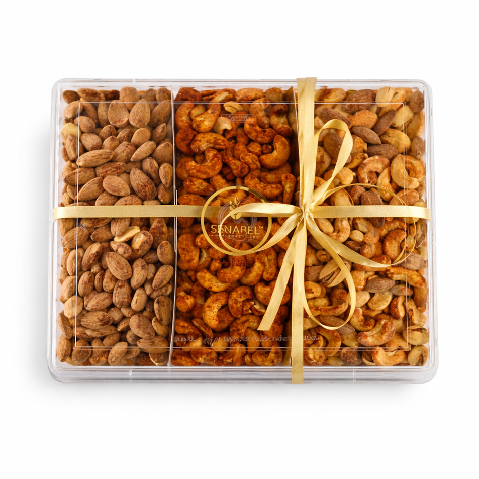 تشكيلة فاخرة من المكسرات المختارة بعناية، مقدمة في بوكس أنيق ومقسّم ليمنحك تنوعًا مثاليًا بين النكهات. خيار مثالي للضيافة أو كهدية مميزة.