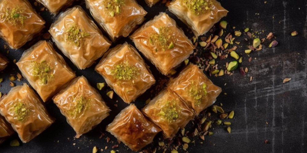 قطع بقلاوة فاخرة محشوة بالفستق الصافي ومغلفة بطبقة من الشوكولاتة الداكنة تجمع بين القرمشة والنكهة الغنية مع لمسة فستق ناعمة على السطح.