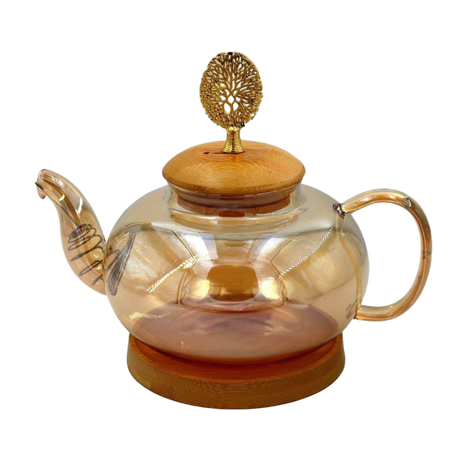إبريق شاي زجاجي 1 لتر مع غطاء خشبي نحاسي وقاعدة خشبية