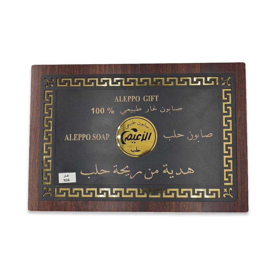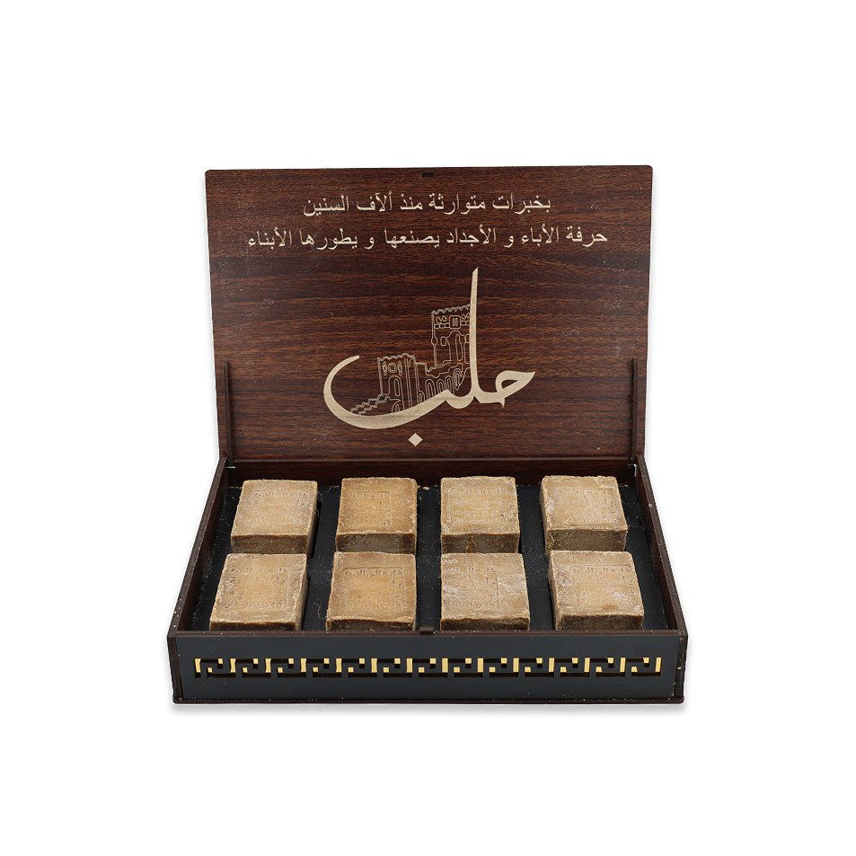 صابون غار حلبي فاخر داخل علبة موزاييك خشبية أنيقة، يجمع بين أصالة الحرفة الحلبية وجودة المكونات الطبيعية.