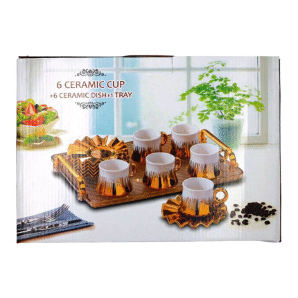 طقم فناجين قهوة مع صينية – لون أبيض مع نحاسي