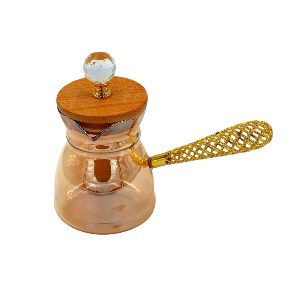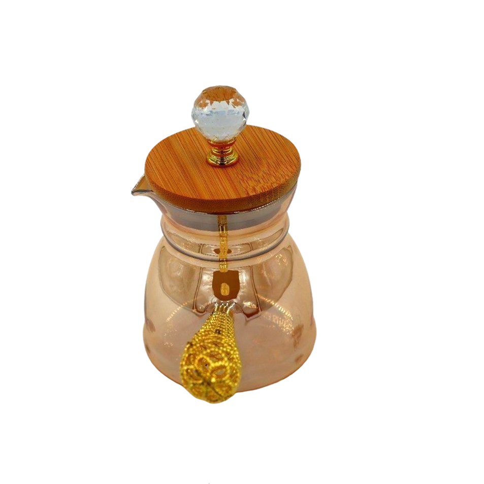 دلة قهوة زجاجية فاخرة بمقبض ذهبي وغطاء خشبي مع كريستال
