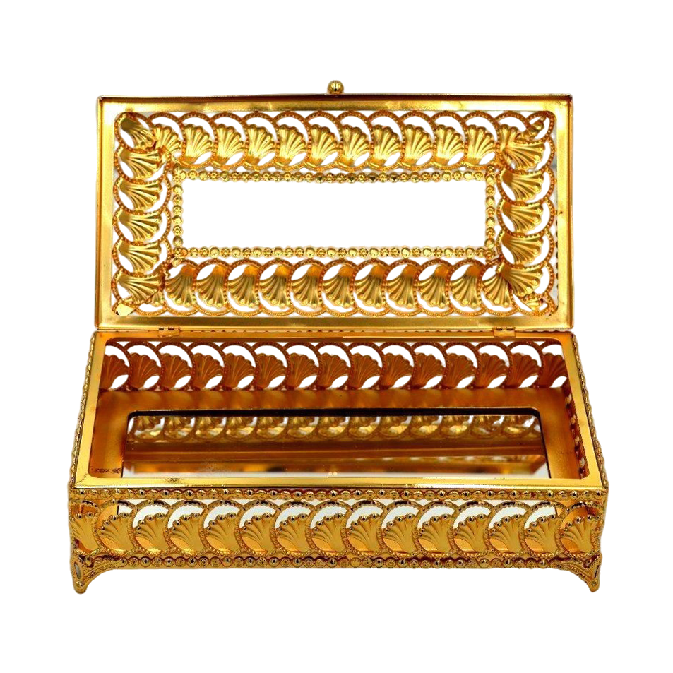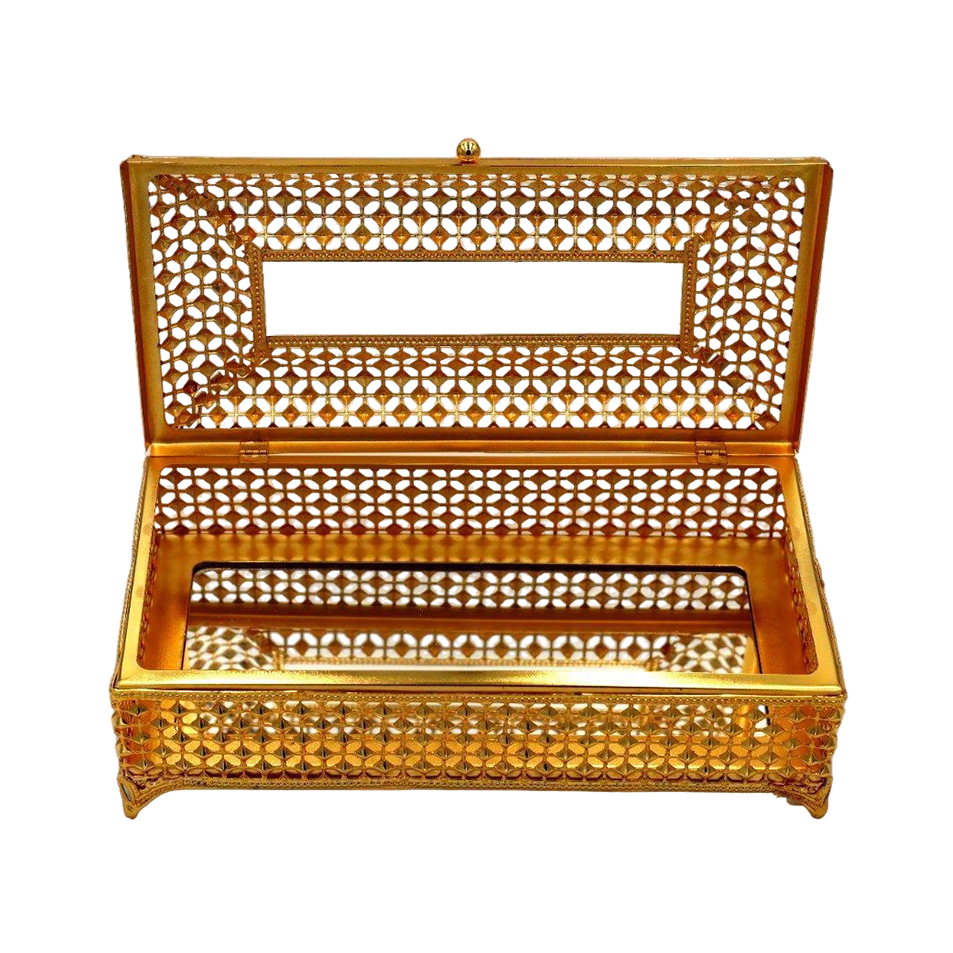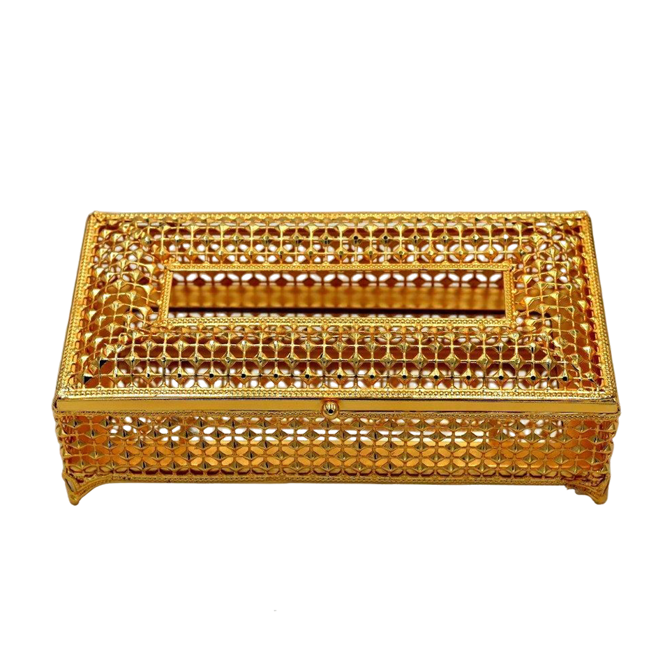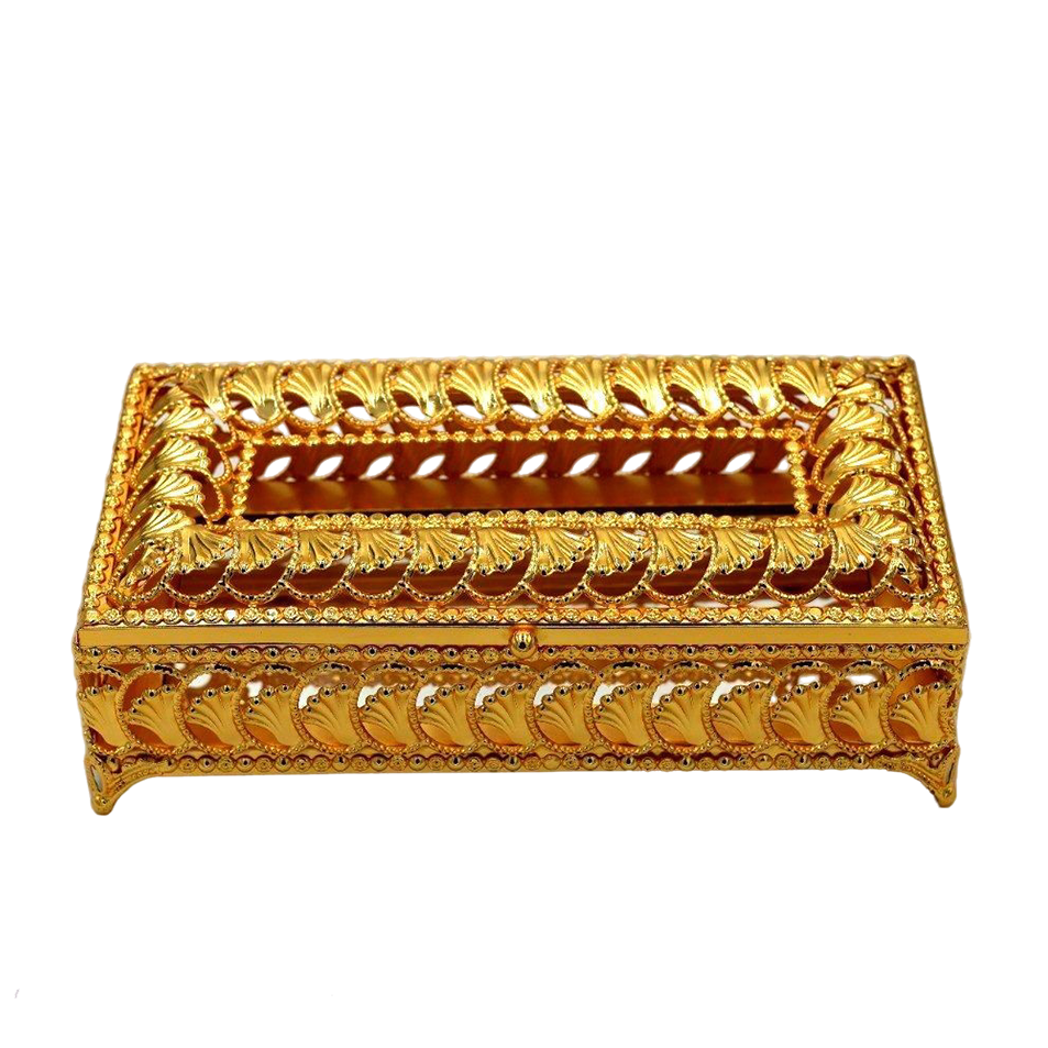 علبة محارم ذهبية فاخرة بتصميم معدني راقي، متوفرة بنقشتين مميّزتين لإضافة لمسة أناقة وفخامة على أي مكان.