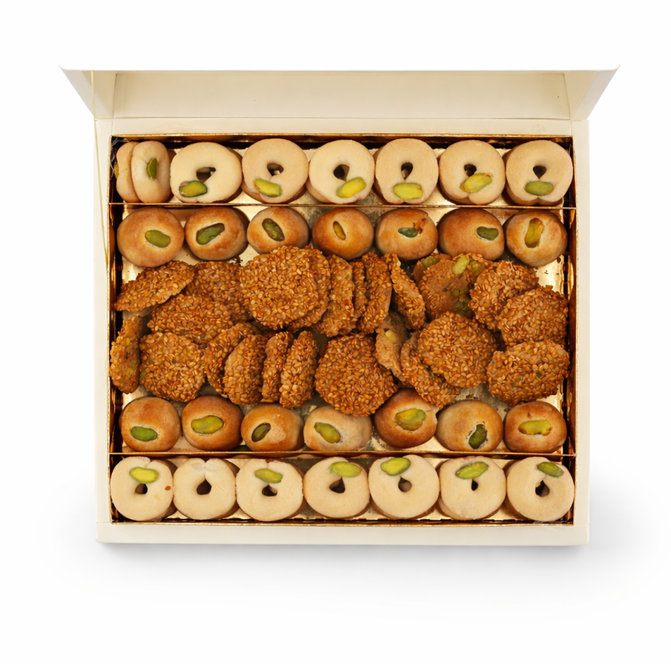تشكيلة فاخرة من النواشف المشكلة بعناية، تضم أصنافًا مختارة بقوام متنوع ونكهة متوازنة، مرتبة داخل علبة كرتونية أنيقة، مناسبة للضيافة والتقديم في المناسبات والجلسات اليومية.