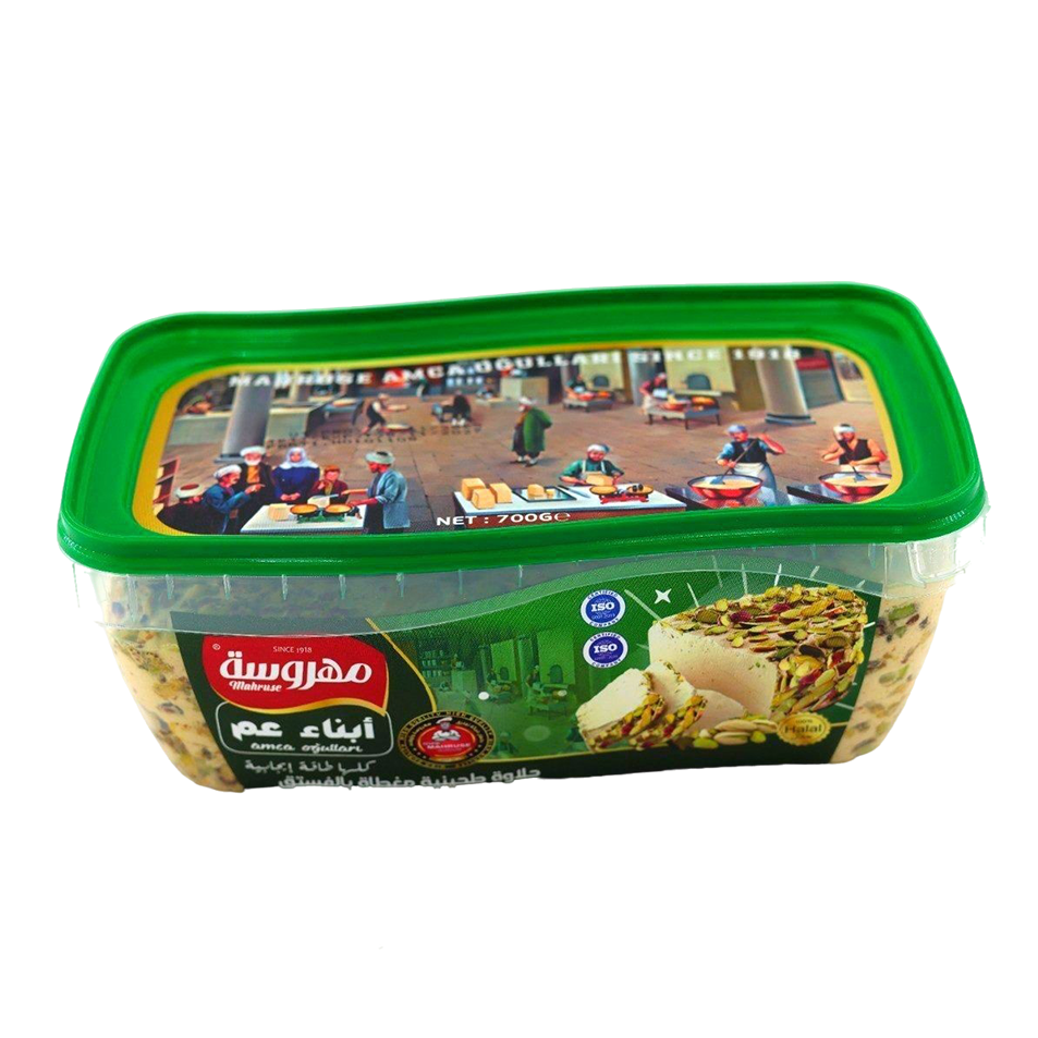 حلاوة طحينية فاخرة محضّرة من طحينية السمسم الخالص، مغطاة بحبات الفستق المختارة بعناية. تمتاز بقوام متماسك وطعم غني يجمع بين حلاوة الطحينة ونكهة الفستق الواضحة، مناسبة للاستخدام اليومي والضيافة.