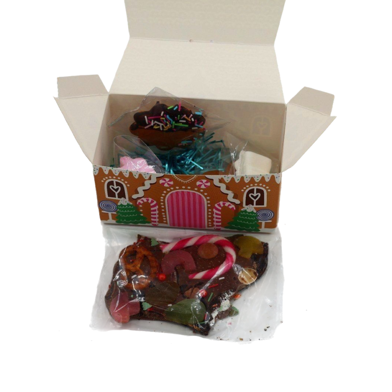 En unik presentförpackning i form av ett pepparkakshus som kombinerar skönhet med en festlig touch. Den innehåller en mängd olika individuellt förpackade sötsaker, vilket gör den till den perfekta presenten för barn och för servering vid speciella tillfällen. Förpackningen har glada färger och vackra dekorationer med en tygrosett som ger en elegant touch.