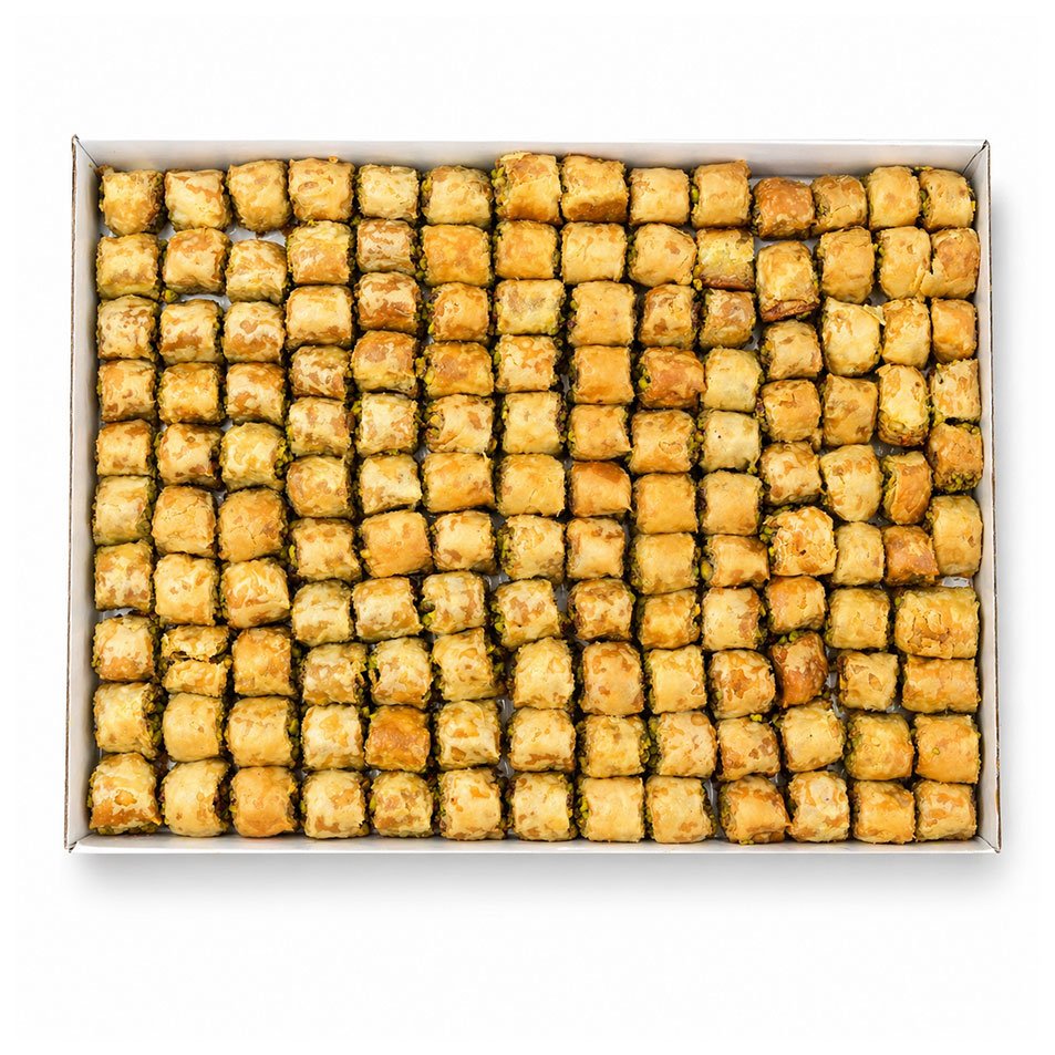 صينية فاخرة من كول وشكور المحشوة بالفستق، تتميز بحجمها الصغير وقوامها المقرمش مع طعم غني يجعلها خيارًا مثاليًا للضيافة.